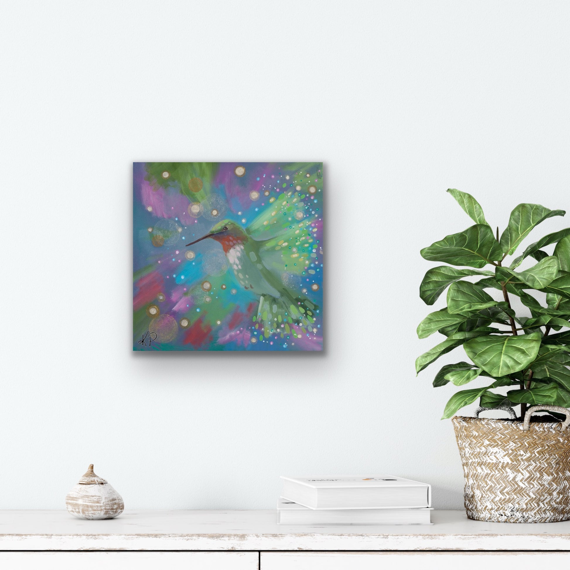 The twelfth & thirteenth hummingbird in flight series, “Celebration” and “Pivot to Joy” are a little different than my usual mosaic-like style. These have a more whimsical, lighter feeling. I didn’t want to risk overworking the small canvases, and I’m glad I didn’t. You can still see the movement conveyed, but the dots almost resemble airborne confetti rather than mosaic, which I enjoyed for these pieces. Originally painted 14”x14” acrylic on canvas. Option the add gold embellishment.